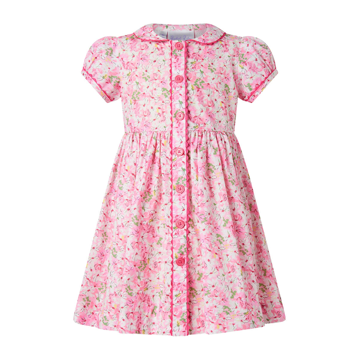 A Rachel Riley favorite, the Daisy Button-front Dress is the perfect blend of style and function. Featuring a stunning floral print is shades of ivory and green on pink background, this dress is completed with contrasting fuschia trimming and buttons for a timeless look.