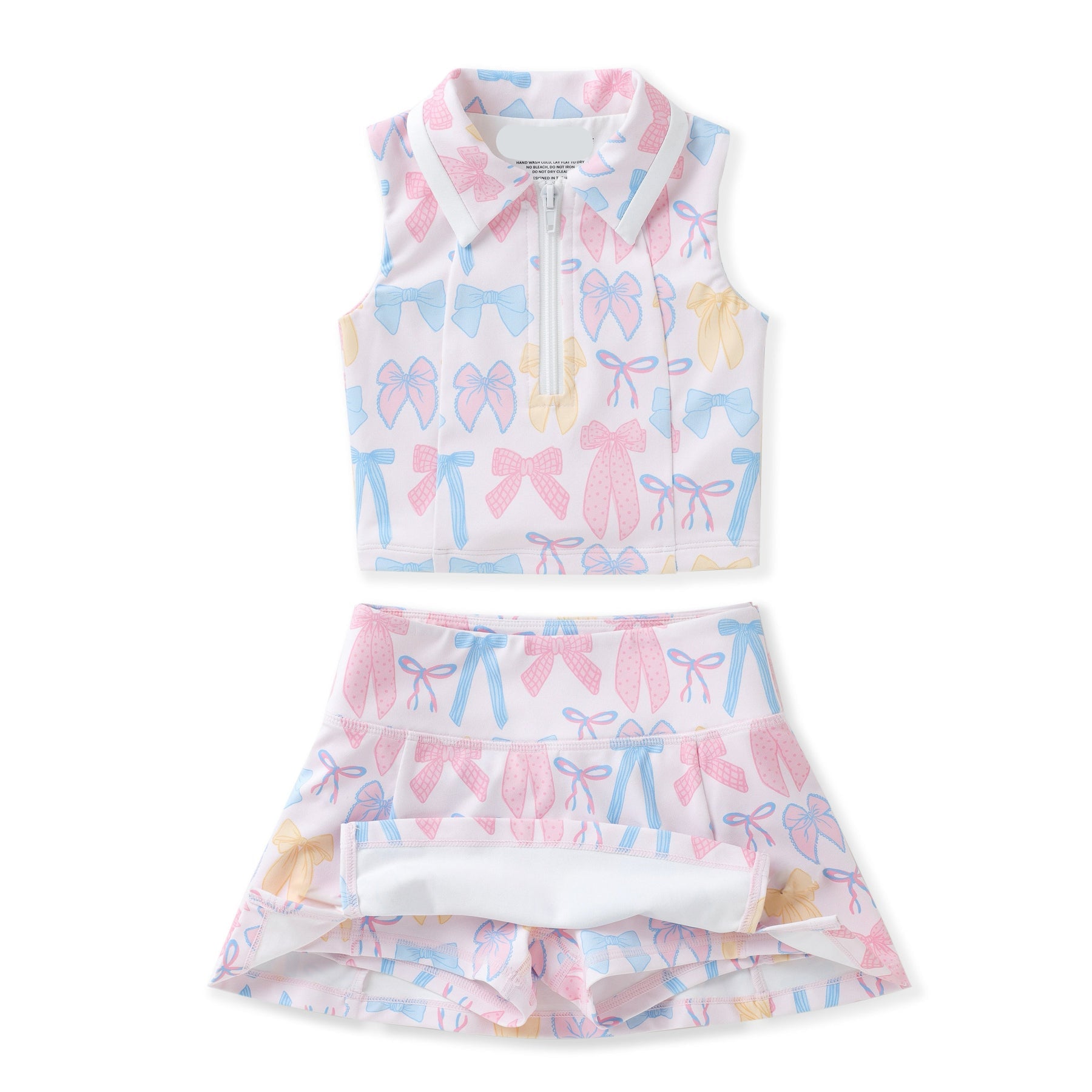 The sleeveless collared tank top is finished with a half-zip front for easy on-and-off and a tailored look, while the matching skort-style bottom includes built-in shorts for confident movement. Crafted from lightweight, breathable performance fabric, this set keeps her cool and comfortable through playdates, practices, and warm-weather outings.
