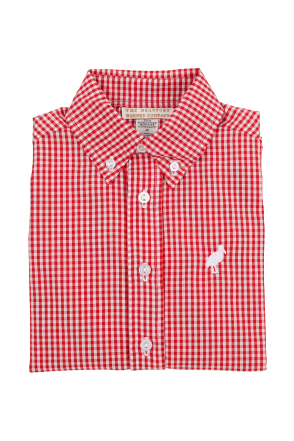Your dapper little gent is sure to look perfectly put together in our Dean's List Dress Shirt in Richmond Red Mini Gingham with Worth Ave White Stork. Roll the sleeves for an extra sporty look.